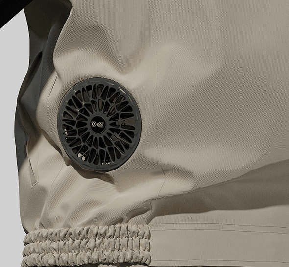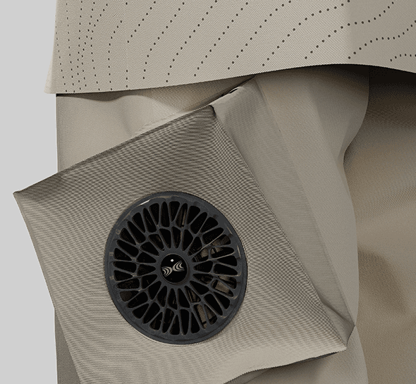 The large volume of air drawn into the clothing by the fans of KUCHOFUKU creates a substantial space between the skin and fabric, maximizing SOLAMENT™’s heat-blocking effectiveness. By significantly cutting near-infrared light while keeping air moving, it promotes sweat evaporation making outdoor work more comfortable.